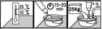 | 工作溫度: 10℃~25℃ | 使用時間: 15~20分鐘 | 加水量: 25公斤-約6.0升 |